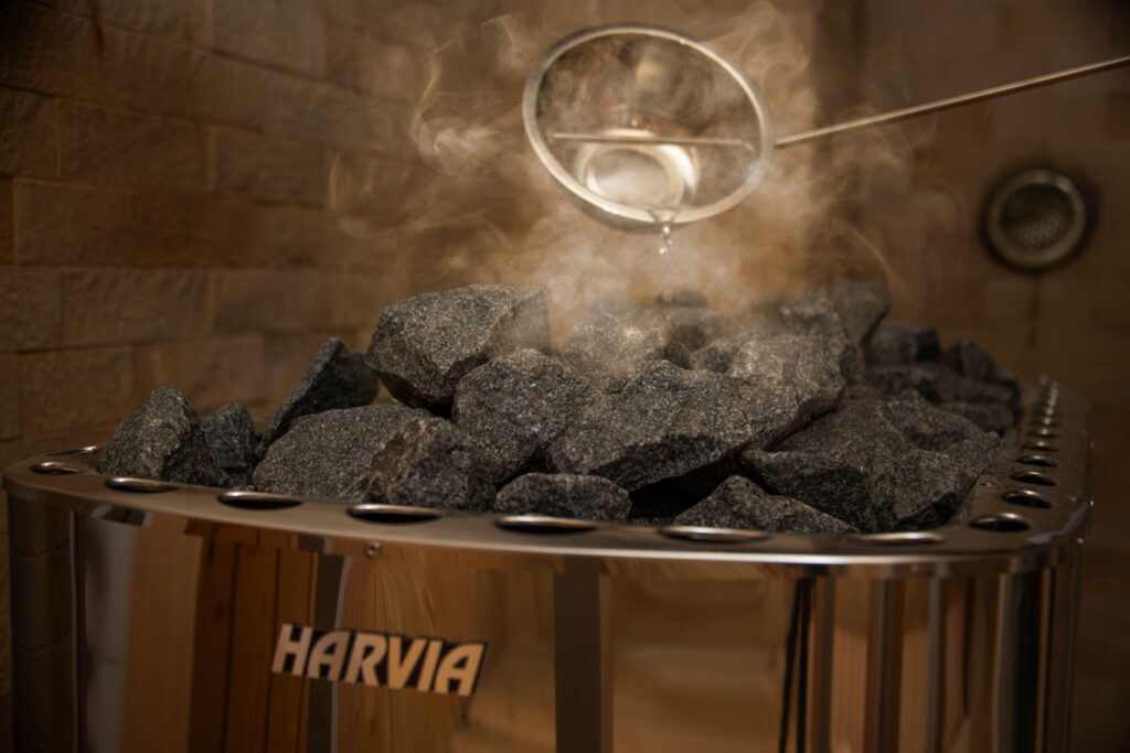 ロウリュサウナでは、熱したサウナストーンに水をかけて蒸気を発生させることで、心地よい熱気を体感できます。