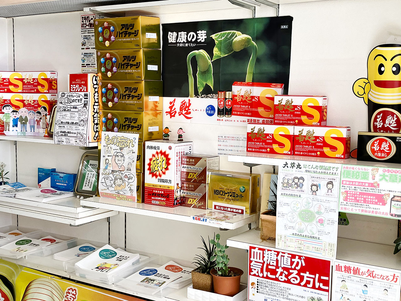 お店おススメの商品は、薬用人参成分を配合した滋養強壮剤【若甦(じゃっこう)】や天然由来のアミノ酸でつくられたビタミン剤【レバコール】。