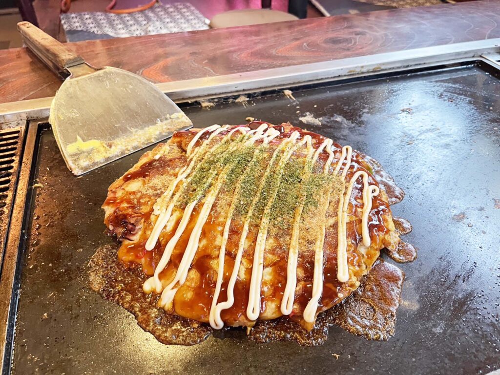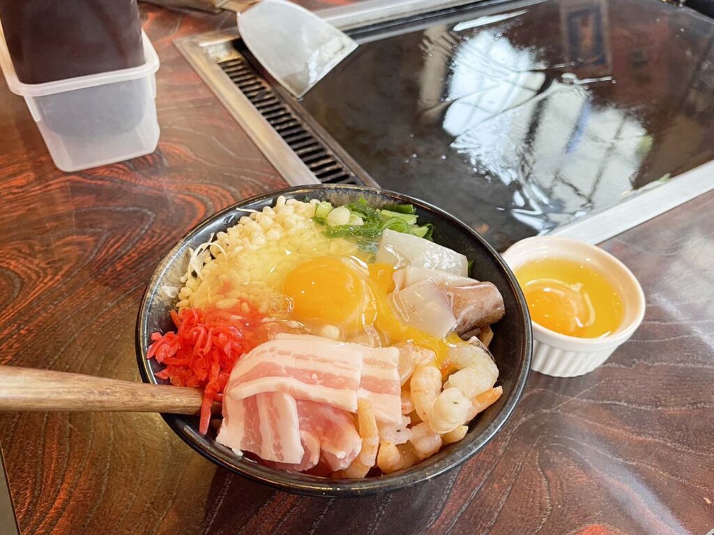 鉄板から直接ヘラで味わうもんじゃ焼きも人気で、リピーターが多い一品です。