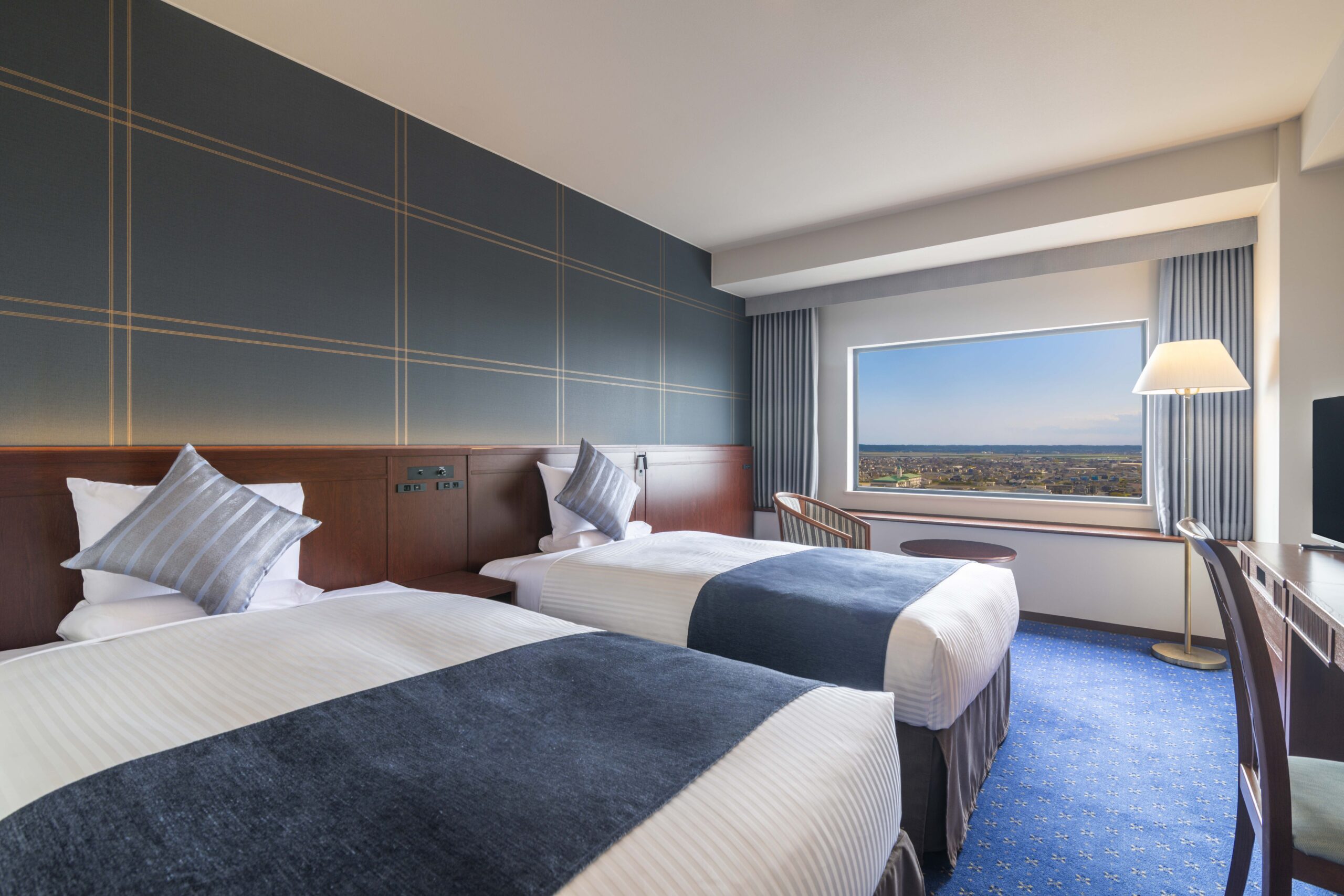 ブルーグレーを基調としたシンプルモダンな客室は落ち着いた雰囲気で、ゆったりとお過ごしいただけます。